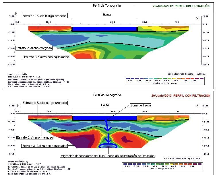 En la imagen superior derecha, se observa una fuga de agua producida en la base de una balsa de riego, que después de transcurrido un año a comenzado a infiltrarse en el estrato calizo subyacente.